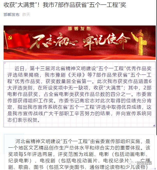 河北省精神文明建設“五個一工程”由省委宣傳部組織實施,是一個地區(qū)文藝精品創(chuàng)作生產(chǎn)總體水平和綜合實力的重要體現(xiàn)。該獎項每5年評選兩屆,評獎范圍為戲劇、電影(包括動畫電影、紀錄電影)、電視劇(包括電視動畫片、電視紀錄片)、廣播劇、歌曲、圖書(包括文學類圖書、通俗理論讀物和少兒讀物)共六個門類,本屆共有75部作品獲獎(省直單位33部,各地市42部),代表了我省文藝創(chuàng)作生產(chǎn)的最高水平。