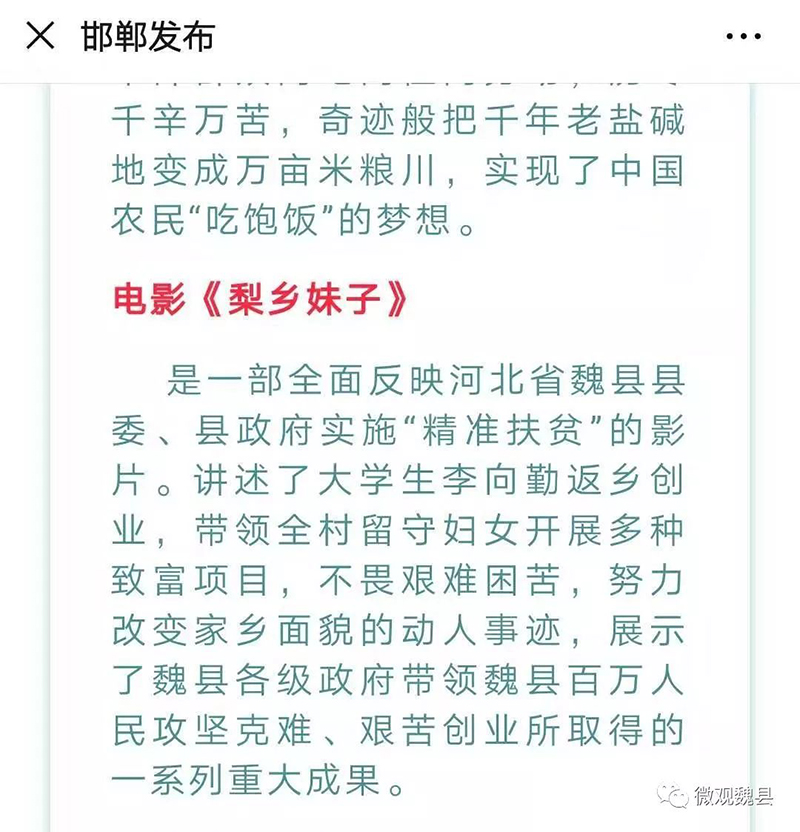 是一部全面反映河北省魏縣縣委、縣政府實施“精準扶貧”的影片。講述了大學生李向勤返鄉(xiāng)創(chuàng)業(yè),帶領全村留守婦女開展多種致富項目,不畏艱難困苦,努力改變家鄉(xiāng)面貌的動人事跡,展示了魏縣各級政府帶領魏縣百萬人民攻堅克難、艱苦創(chuàng)業(yè)所取得的一系列重大成果。