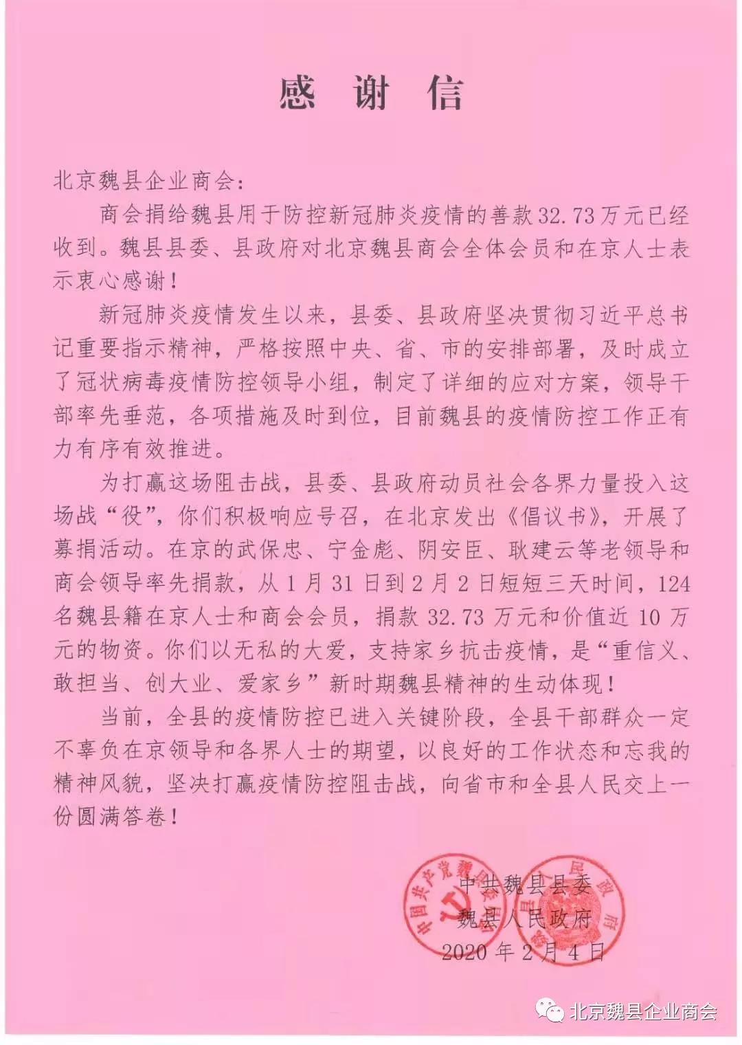 隨著抗疫工作形式嚴(yán)峻,全國發(fā)動(dòng)了抗擊疫情的阻擊戰(zhàn)。北京魏縣企業(yè)商會(huì)發(fā)出了《抗擊肺炎共渡難關(guān)公益慈善活動(dòng)的倡議》,魏縣籍在京人士和會(huì)員積極響應(yīng)倡議并進(jìn)行捐款捐物,為抗擊疫情做出魏商貢獻(xiàn)。《倡議書》發(fā)出后,武保忠、寧金彪、耿建云、張軍領(lǐng)等商會(huì)顧問和研究會(huì)成員主動(dòng)參與謀劃,和商會(huì)高層率先捐款,呼吁黨員帶頭、高層帶頭,使捐款捐物快速“升溫”。